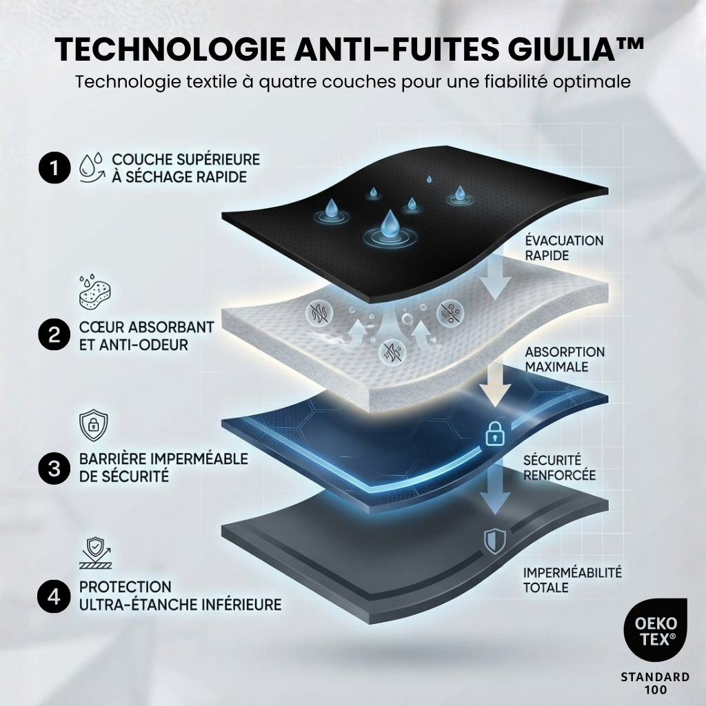 Les culottes anti-fuites Giulia absorbent instantanément les pertes urinaires, bloquent l’humidité et les odeurs, et vous protègent sans aucune sensation de “couche”.